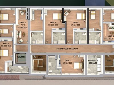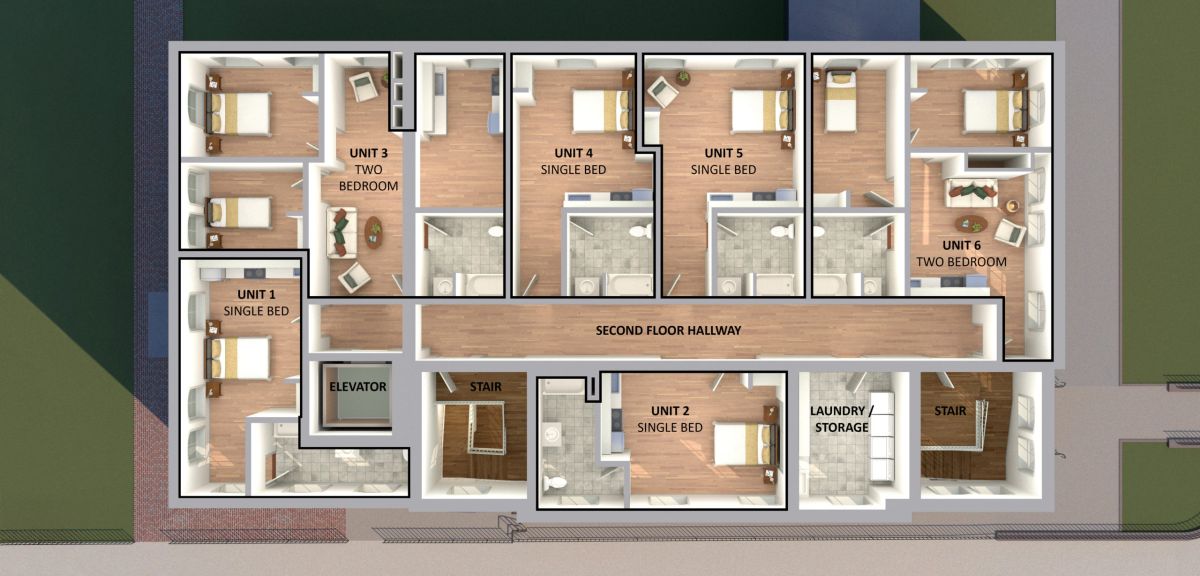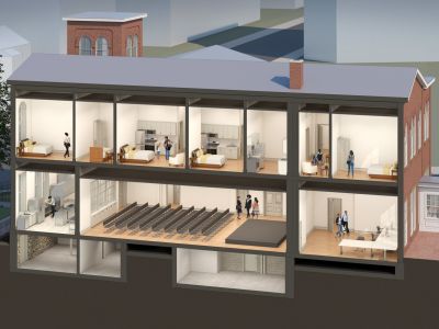 The design preserves the building’s materials and layout while maintaining its character. An accessible entrance on the south side provides access to Fellowship Hall, Church offices, and coLAB Arts workspace. Fellowship Hall is being renovated for coLAB theater and programming, while remaining a meeting space for Town Clock. A new catering and teaching kitchen will support meetings, banquets, and cooking classes for Town Clock clients. Studio and two-bedroom apartments on the second floor are arranged along a common corridor, providing secure, loft-like living spaces with high ceilings and large windows. The renovated basement will house new mechanical systems, improved storage, and Town Clock’s food pantry.