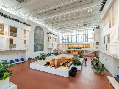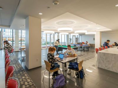 Mills + Schnoering Architects (M+Sa) first conducted a Scope Development Study for the building’s renovation that incorporated existing conditions assessments for all aspects of the building, a code study, and program analysis. M+Sa subsequently designed the comprehensive renovation of the building, which incorporated the building envelope (including masonry, window system, and roof repair); upgrades to residential living units; upgrades to existing common and public spaces (including building entrance lobby, common and dining areas, kitchen, bathrooms, and back-of-house spaces) to improve their quality and amenities; new program spaces in the underutilized basement; and a range of upgrades and/ or replacements to existing mechanical, electrical, plumbing, and fire protection systems.A new passenger elevator serves all main floors and vertical platform lifts connect the atrium and lounge levels to student room levels. A new program of graphic way finding and signage have made the building fully accessible and more easily navigable.