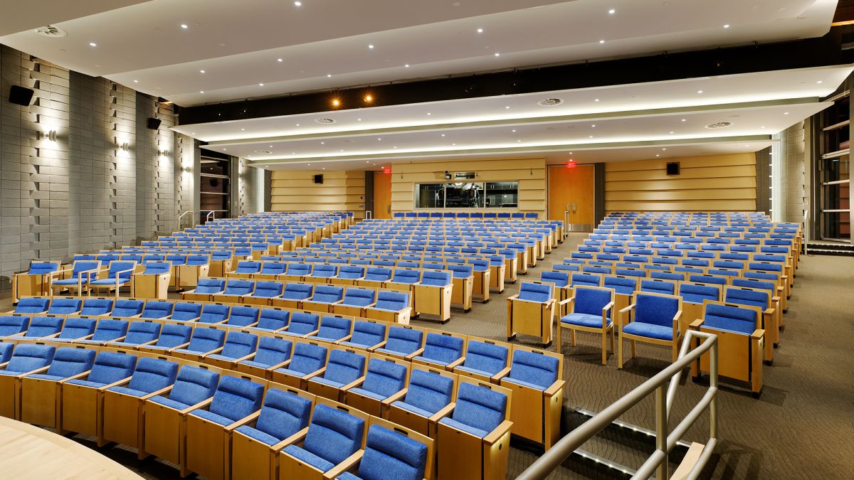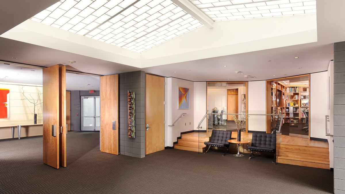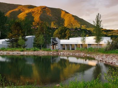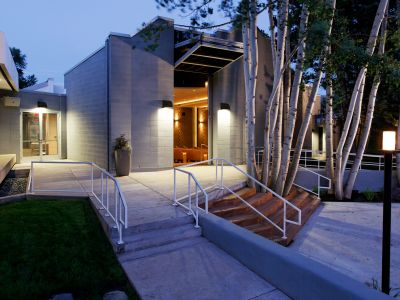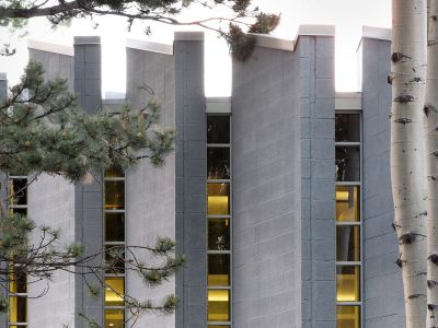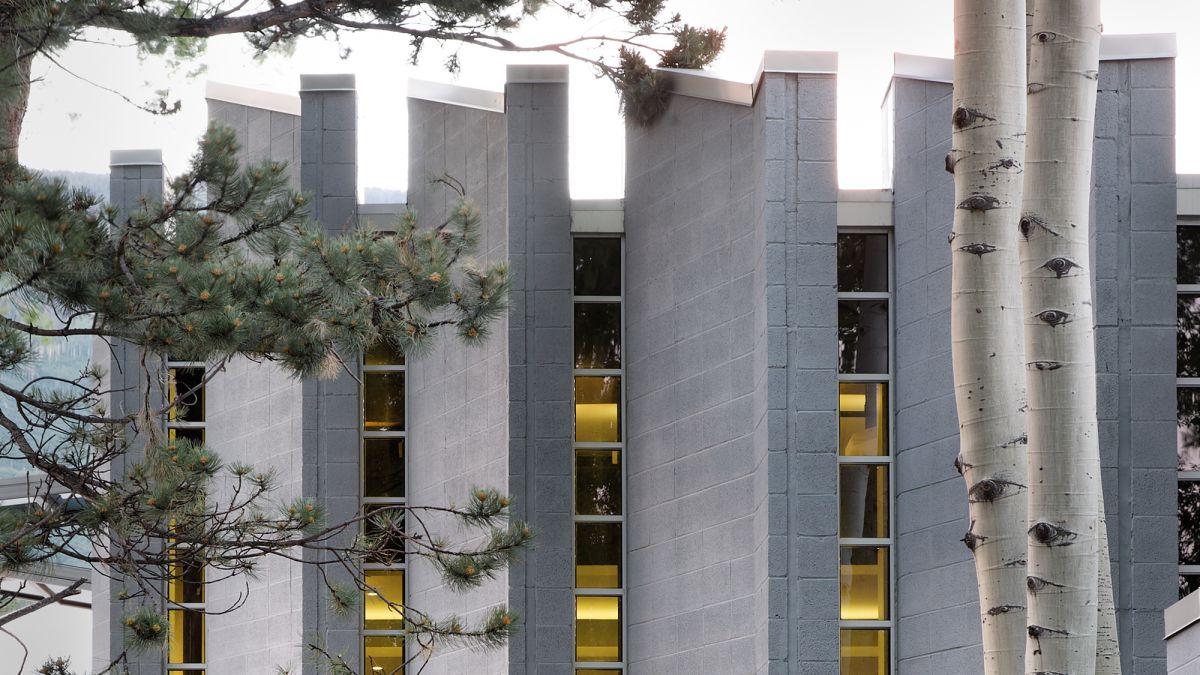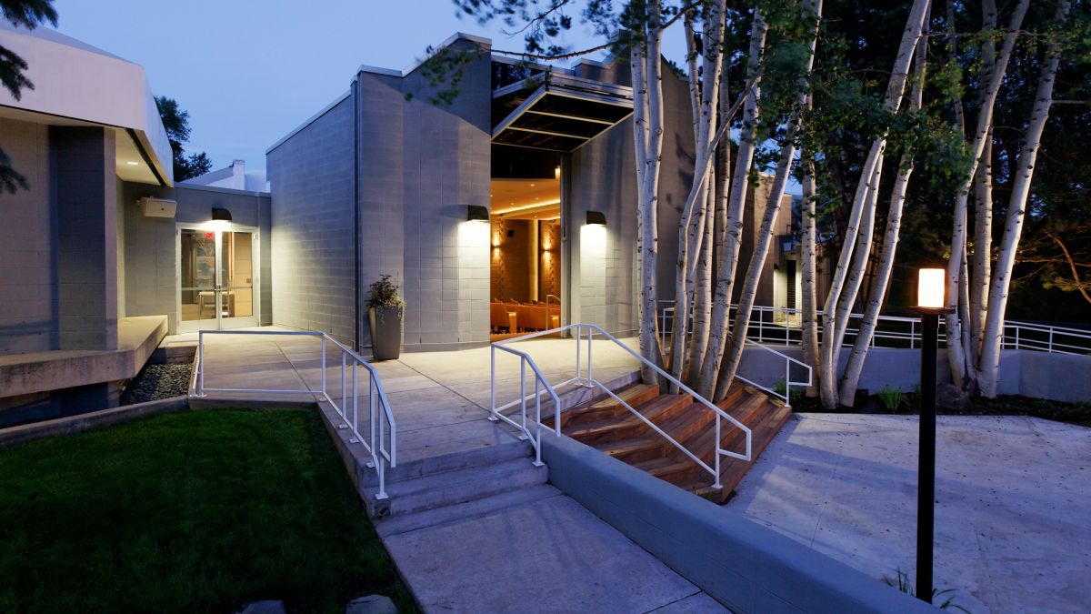 The Paepcke Memorial Building, designed by Herbert Bayer, had remained largely unchanged since its completion in 1962. Bayer conceived a building of simple forms using load-bearing concrete block walls and wood-framed roofs. Among the building’s character-defining features are its tall, narrow windows placed between angled planes of masonry that make up the auditorium’s side walls and reflect the dramatic peaks of the Rocky Mountains. The Memorial Building houses the Institute’s administrative offices and auditorium, which hosts a range of programs from scholarly lectures, films, and recitals to children’s theater and televised productions.