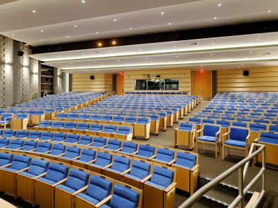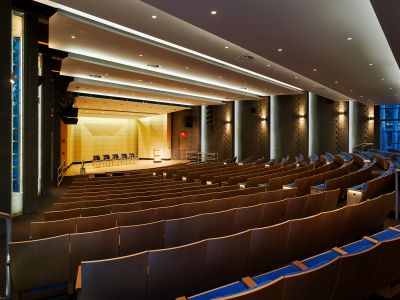 The goal of the project was to preserve the Modern character of the building while upgrading the building envelope, providing much-needed accessibility, introducing contemporary systems, and enhancing performance capabilities. The auditorium was expanded with the design of two small additions at the rear in keeping with the original stepped, angled walls. The expansion and reconfiguration of the auditorium provided accessible seating and access to the stage; increased audience capacity; and improved acoustical quality and viewer sightlines. New overhead glass doors on the sides of the auditorium strengthened the connection to the outside and offered direct access to the exterior terraces. Lighting that emphasized the geometry of the room and provided better visibility was introduced along with full theatrical lighting and controls. The projection room was relocated to increase the size of the lobby. New interior finishes and furniture now enhance the auditorium, gallery, library, and office spaces. Designed to achieve a minimum of LEED Silver, the project attained a high level of energy efficiency through new roofing and fenestration (all in keeping with the original Bayer design) as well as through new mechanical and electrical systems. A stream-fed geothermal pond was introduced to provide heating and cooling.