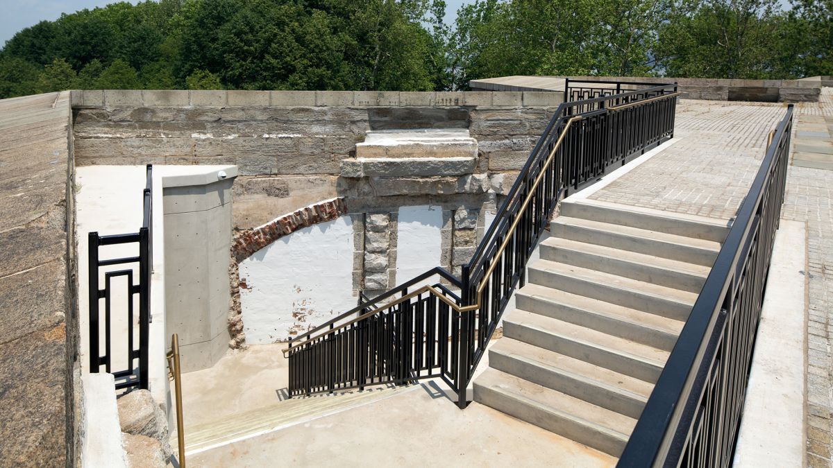 In order to improve egress capacity, a second exterior stair of granite was also added to the east of the Pedestal to match the existing monumental stair to the west. Two new stairs from the Terreplein to grade provide the last link in the egress route for visitors, exposing buried archaeological elements. These interventions have made the structure more welcoming, safe, and accessible while preserving the significant historic features of this World Heritage Site.