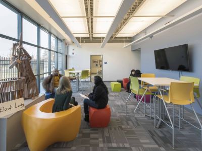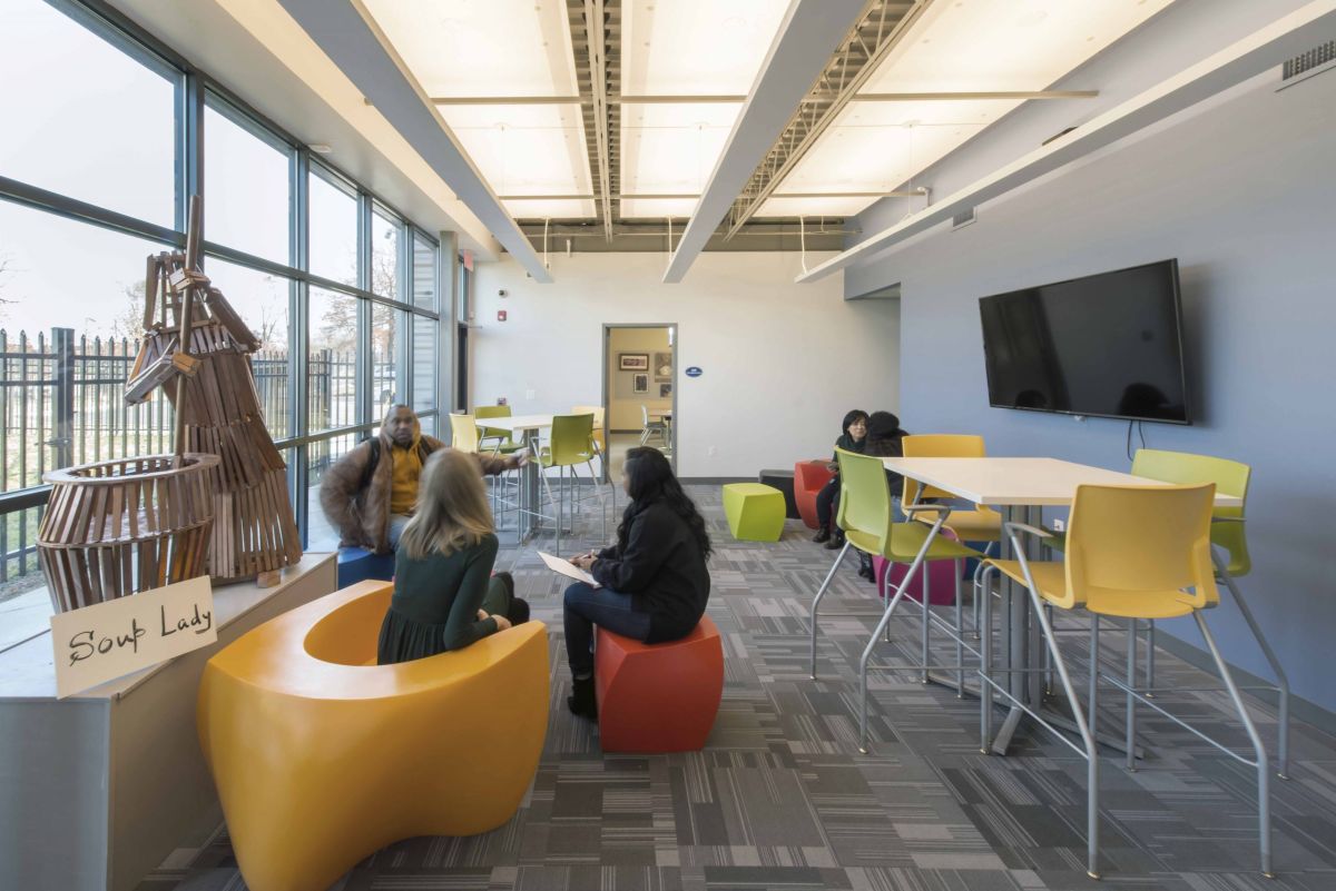 TASK’s original one-story building was constructed in 1991. Mills + Schnoering Architects was engaged to renovate the existing building and design an addition to accommodate the organization’s expanded programs. The new 3,700 sf addition, sited to the east of the existing TASK building, houses a pair of dedicated adult education classrooms; computer room; administrative offices; conference room; and an open meeting/performance area. The existing building was renovated to include additional offices, added storage, and multipurpose space. On the exterior, a deep overhang above the sidewalk shelters patrons during inclement weather, and an all-glass storefront system on the side provides views to a community garden on the adjacent property. Shortly after completion of the new addition, M+Sa returned to TASK to renovate and expand the organization’s kitchen.
